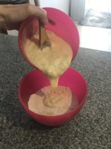 - Add wet ingredients to dry and mix well by hand until it forms into a batter.